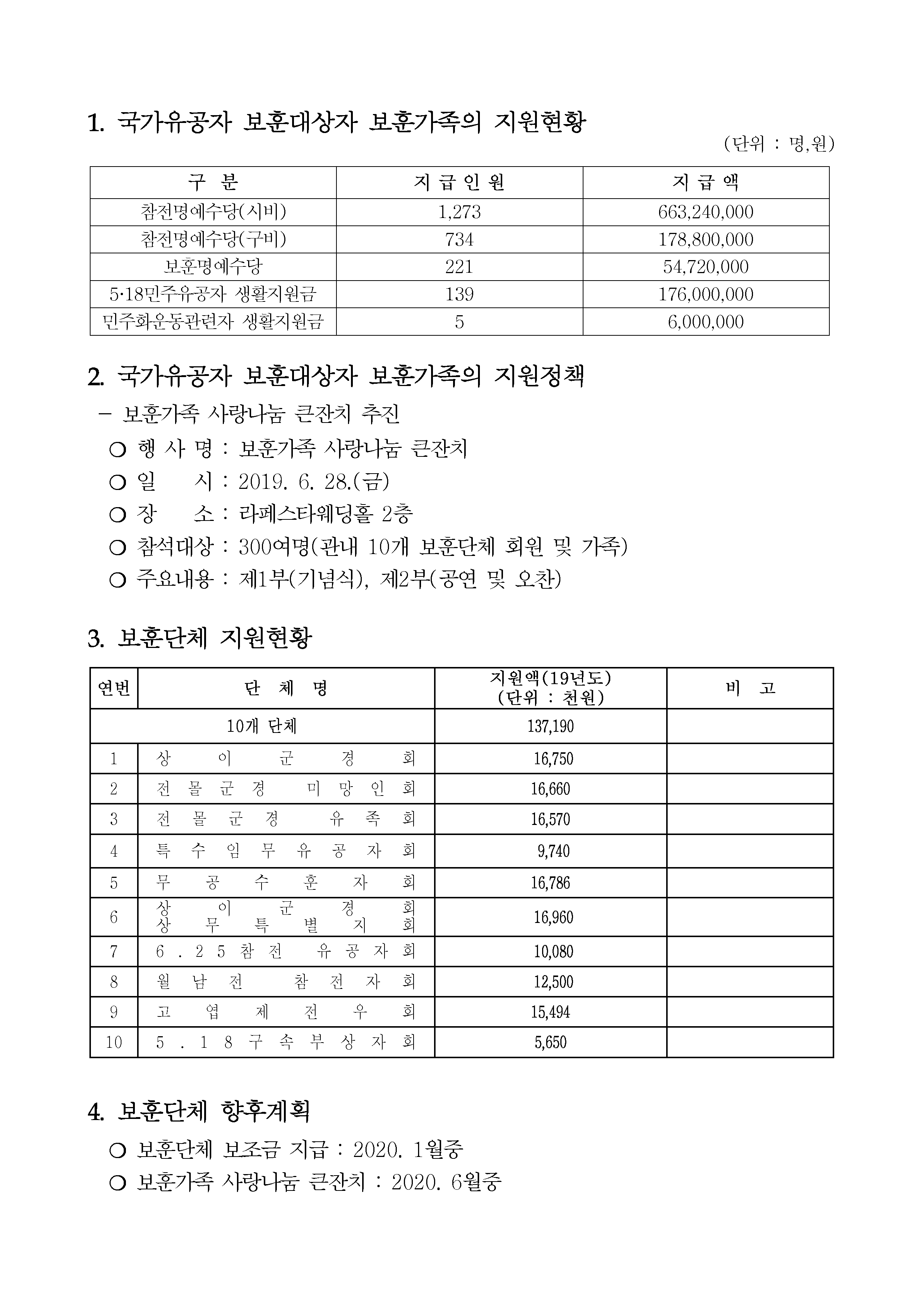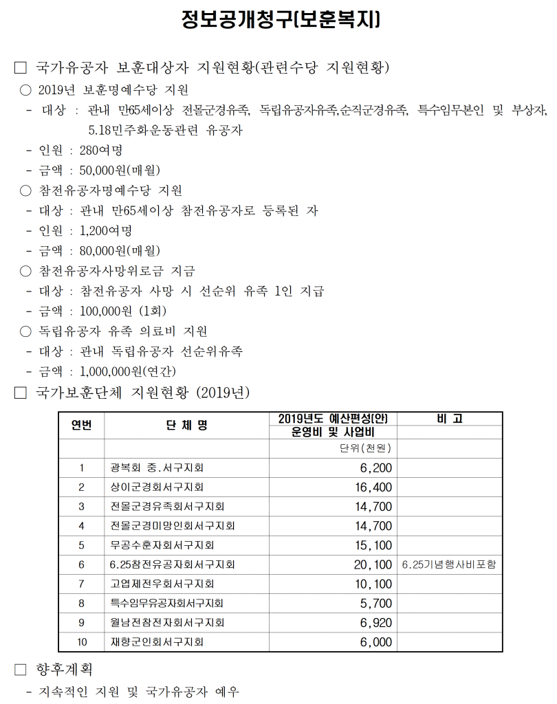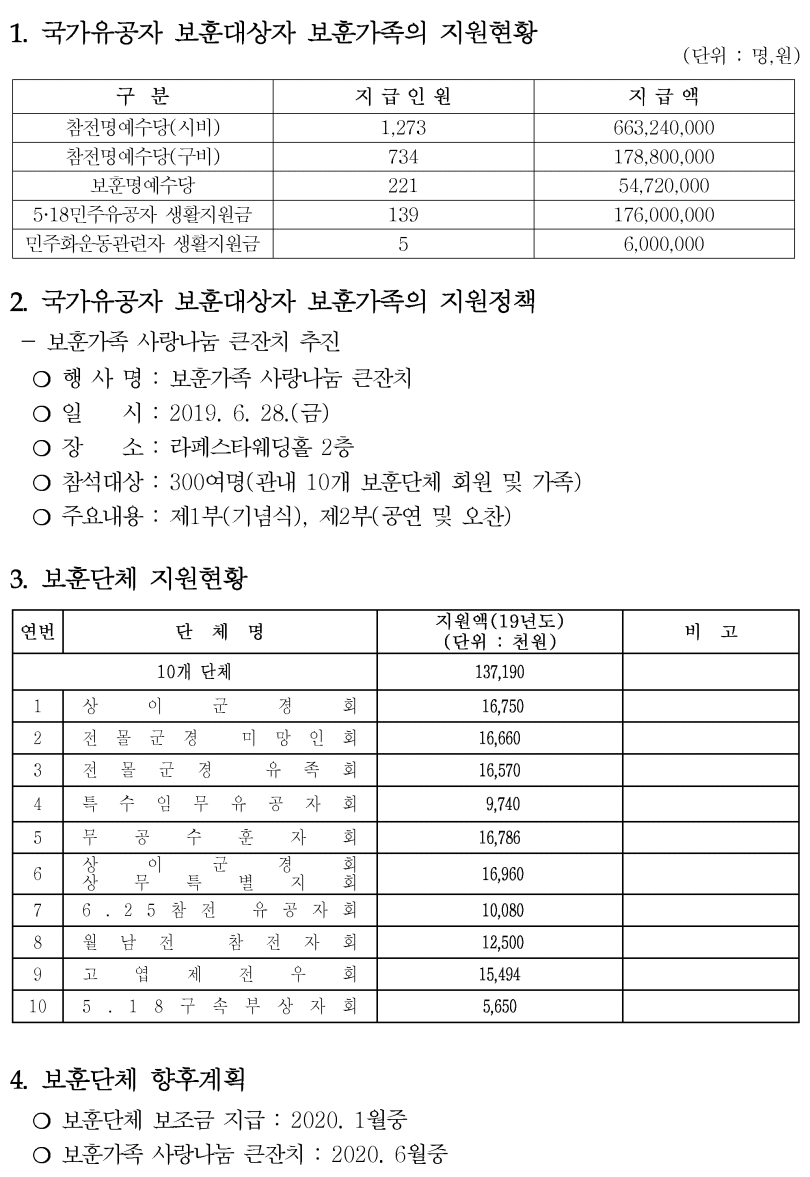 광역단체 지방자지단체별 국가유공자 보훈대상자 참전유공자 보훈명예수당 보훈영예수당 참전명예수당 배우자수당 유족수당 위문품 보훈단체 지원 현황