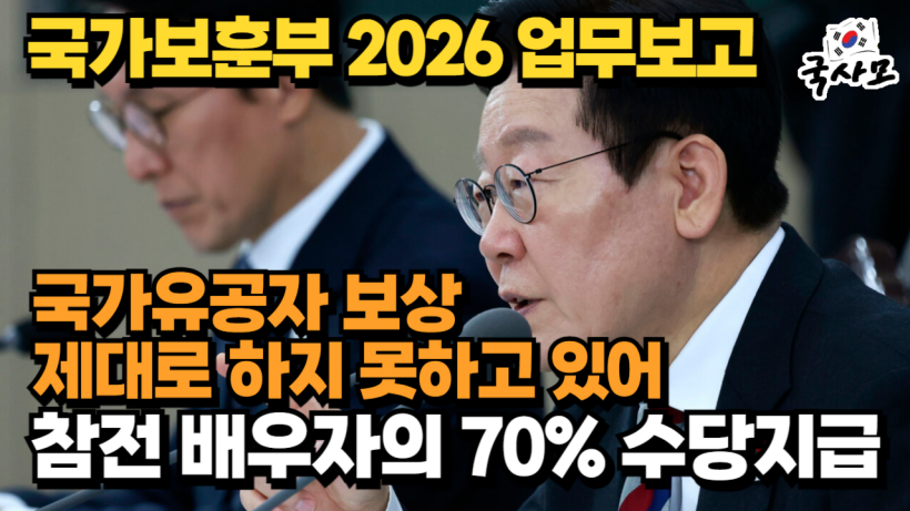 국가보훈부 2026 업무보고, 국가유공자 보상을 제대로 하지 못하고 있다는 결론, 참전유공자 배우자 전체의 70%까지 수당 지원 요청, ‘국가 공동체를 위한 특별한 희생에 특별한 보상’ 실현을 위한 4대 전략* 및 8대 핵심과제 추진, ①희생과 헌신에 합당한 보훈보상, ②건강한 삶을 지키는 의료복지, ③국민과 함께 기억하는 보훈문화, ④혁신으로 도약하는 미래보훈