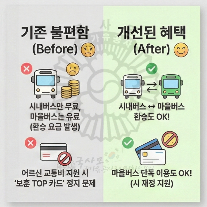 그동안 국가보훈부와 전국버스운송사업조합연합회의 협약을 통해 시내버스 등 대중교통 요금 지원은 이뤄져 왔으나, 마을버스는 지원 대상에서 제외돼 있었다. 이에 따라 국가유공자가 시내버스에서 마을버스로 갈아타거나 마을버스만 단독으로 이용하면 요금을 본인이 부담해야 하는 불편이 있었다.
