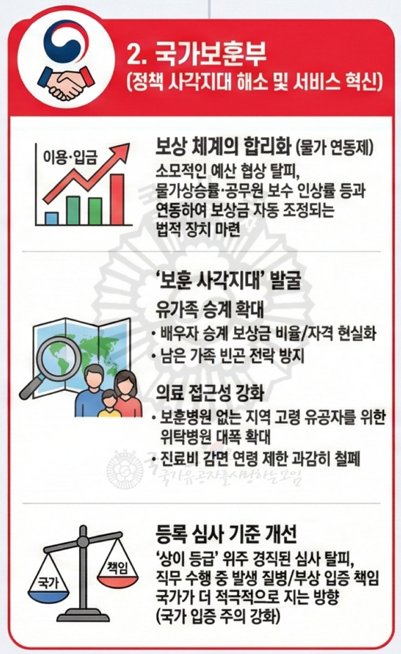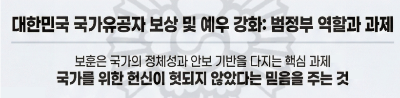 대한민국 국가유공자와 보훈가족에 대한 보상과 예우는 단순한 복지차원을 넘어 '국가의 정체성과 안보 기반'을 다지는 핵심 과제입니다.