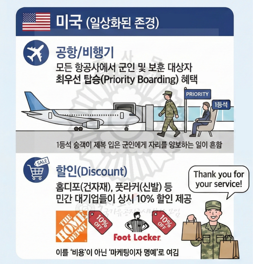공항에서 제복 입은 군인은 1등석 승객보다 먼저 탑승하는 '최우선 탑승(Priority Boarding)' 혜택을 부여합니다.