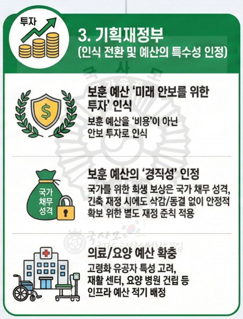 재정당국은 혁신적 인식전환 및 예산의 특수성 인정하고 보훈예산을 '비용'이 아닌 '미래 안보를 위한 투자'로 인식해야 합니다.