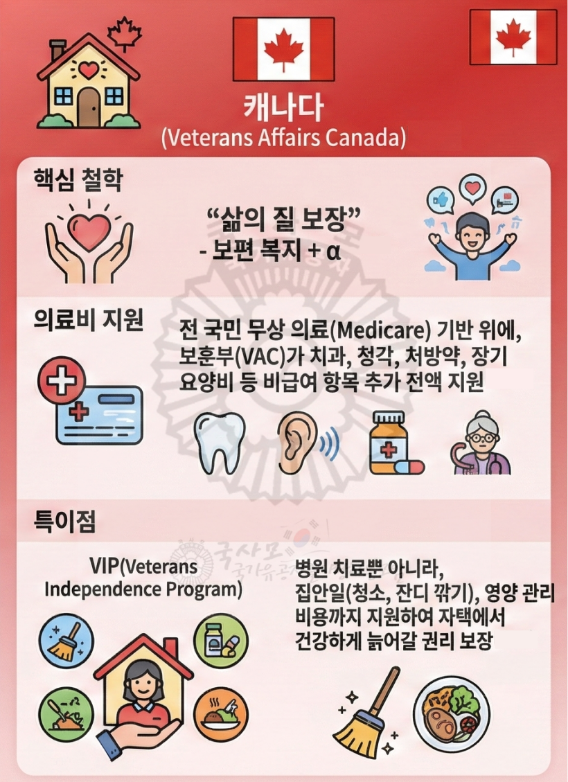 캐나다는 이보다 한술 더 떠, 전 국민 무상의료 기반 위에 보훈부가 치과 등 비급여 항목을 추가로 전액 지원합니다.