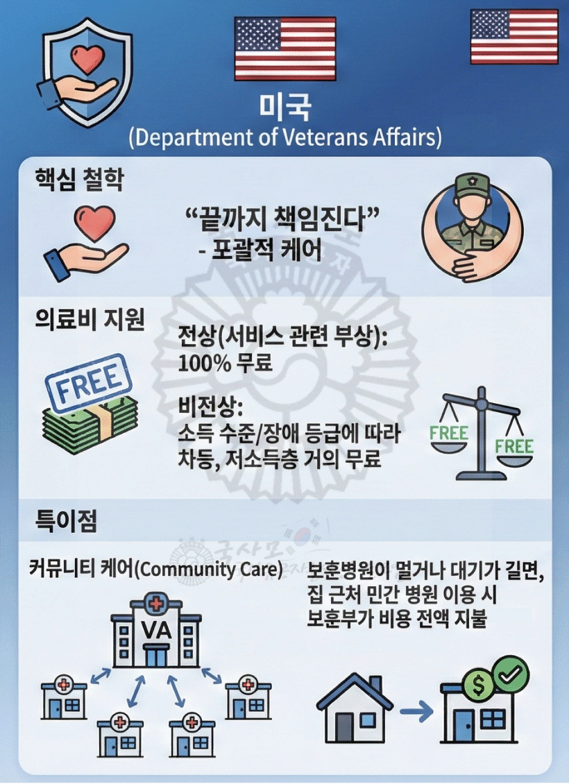 먼저, 미국이나 캐나다 등 보훈 선진국의 '의료비 전액 지원 시스템과 사회적 예우 문화, 보상 시스템'과 같은 구체적인 정책 사례와 한국의 현황을 비교 분석하고 우리가 나아갈 방향을 제시하여 드리겠습니다.